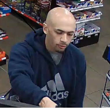 The suspect in both robberies is described as an Hispanic male, about 6'0" tall, 180 pounds, bald with a black goatee and mustache. He was last seen wearing a blue hooded sweatshirt with “Addidas” on the front with grey sweat pants. See the attached photos.