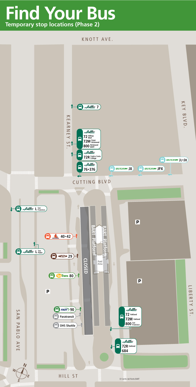 The second phase will begin Tuesday, October 16 and will affect AC Transit stops and service. Phase 2 is scheduled to last for two weeks. AC Transit lines 7 and northbound 72, 72M, 72R, and 800 will be relocated to Kearney Street. AC Transit lines 76 and 376 and WestCAT lines JL; JPX; and JR will be relocated to Cutting Boulevard.