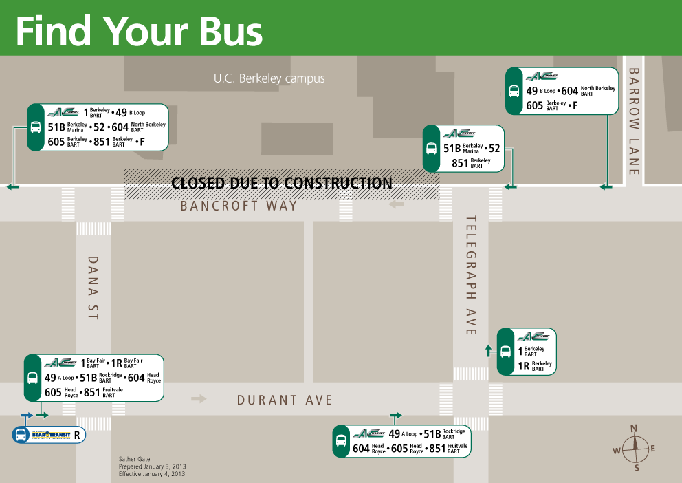 Due to construction, the bus stops along Bancroft Way between Dana Street and Telegraph Avenue in Berkeley will be relocated effective Friday, January 4.