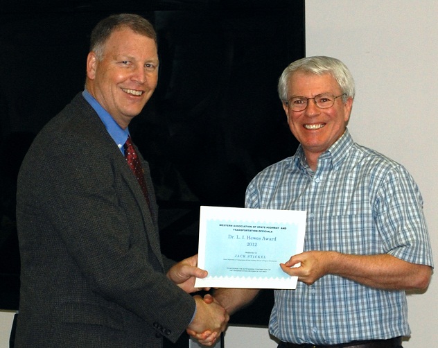 For Immediate Release: July 9, 2012 Stickel Wins Prestigious Dr. L.I. Hewes Award (JUNEAU, Alaska) – Jack Stickel, Alaska Department of Transportation and Public Facilities (DOT&PF) Transportation Information Group Manager, was honored today by his peers at the Western Association of State Highway and Transportation Officials (WASHTO) annual conference in Colorado Springs, Colorado by winning the prestigious Dr. L. I. Hewes Award. The award recognizes a recipient’s outstanding contribution to the highway development program in the Western Region of the United States. “This is only the second time that an Alaskan has won this award,” said DOT&PF Commissioner Marc Luiken. “It is a huge honor for Jack and for the department.” Mr. Stickel’s leadership skills are an accumulation of over 20 years in developing solutions to meet DOT&PF’s transportation data requirements. His current position oversees the department’s Transportation Information Group that is in charge of collecting and analyzing the statewide data for highway safety, traffic, traveler information, road weather services, and asset management – all of which are both state and federal requirements. Along with overseeing numerous statewide projects, Mr. Stickel has fostered partnerships with numerous local, regional, federal and Canadian organizations. These partnerships allow for the sharing of data that mutually benefits each organization and, in turn, provides more efficient and reliable information for the traveling public. Mr. Stickel’s work can be viewed across the entire state from weather cameras and sensors along to Klondike Highway to mobile phones when checking Alaska 511 for current weather and driving conditions. The Hewes Award was created in 1951 by Western Construction magazine, a journal devoted to engineering and construction in the western states, to honor Dr. Hewes, a Deputy Commissioner for the Bureau of Public Roads – a precursor to the Federal Highway Administration (FHWA). Hewes was one of the prime organizers of WASHTO and “his superlative contributions in every phase of highway engineering gave great impetus to western highway development.” |