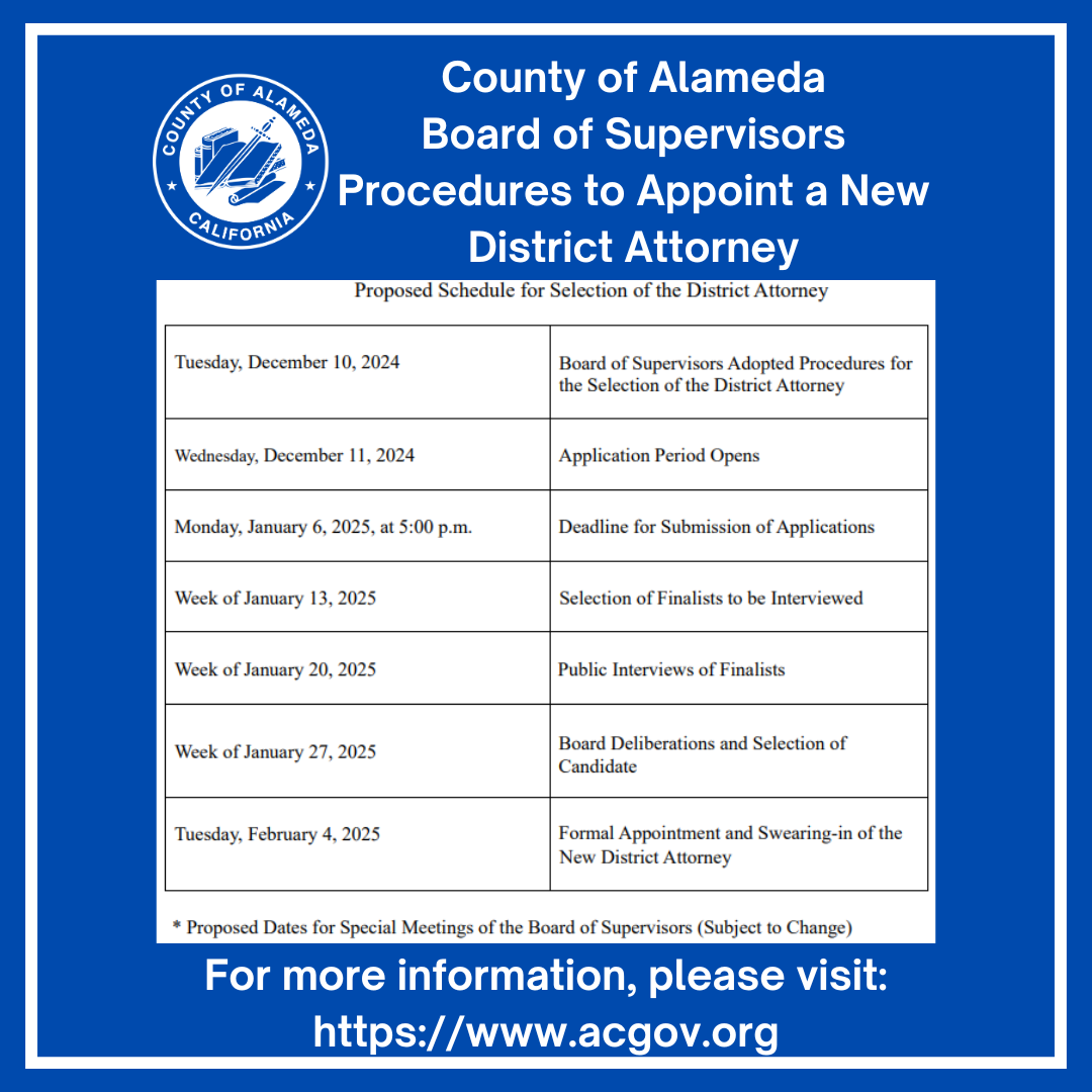 To apply for the Alameda County District Attorney position, please review the County of Alameda Board of Supervisors' procedures for appointing a new District Attorney here.