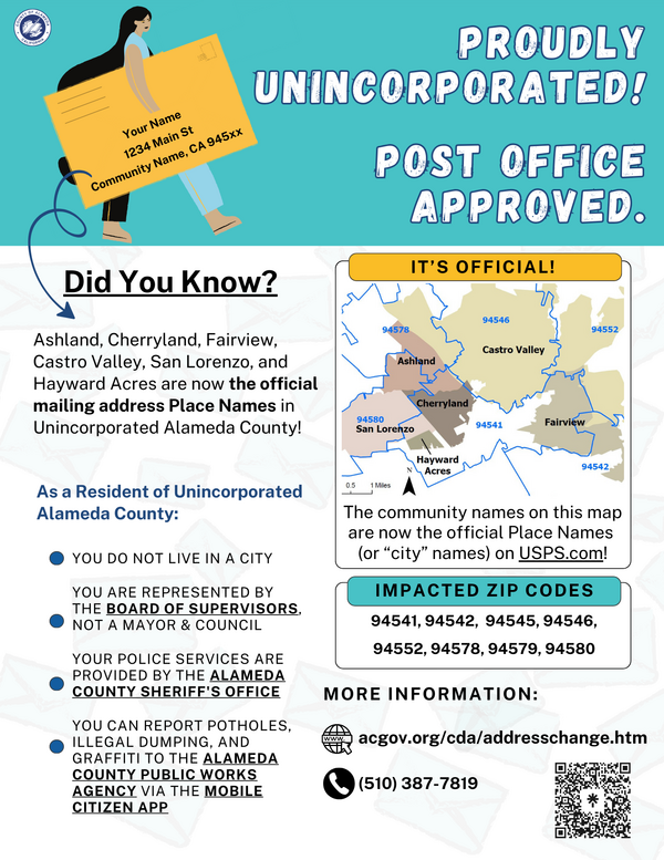 April 2, 2025, Alameda County, CA—Following years of community advocacy, the United States Postal Service (USPS) recently changed a 60-year-old naming convention impacting nearly 29,000 mailing addresses in Alameda County’s urban unincorporated communities. Residents of Ashland, Cherryland, Hayward Acres, Fairview, San Lorenzo, and Castro Valley will now see their unincorporated community name accurately reflected as the default “Place Name” on USPS.com. A “Place Name” (also called a “Preferred Last Line”) is the "City, State" line in a USPS mailing address.