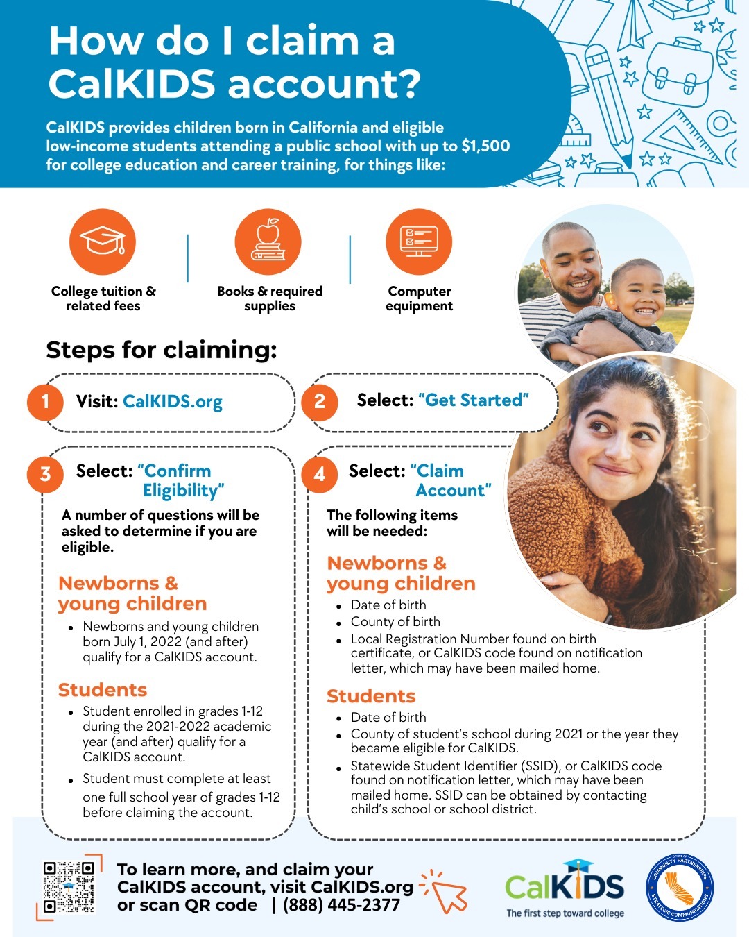 CalKIDS helps make college more accessible by automatically opening savings accounts for every baby born in California and eligible low-income public school students in grades 1–12. Babies born on or after July 1, 2023, receive $100, while those born earlier may receive $25. Additional bonuses are available for account registration and linking to a ScholarShare 529. Eligible students receive $500, plus up to $1,000 more if they are foster youth or homeless. Funds can be used for qualified higher education expenses. CalKIDS supports families in preparing financially for the future, especially those from underserved communities. Funding amounts are subject to change. For more information, please visit here.