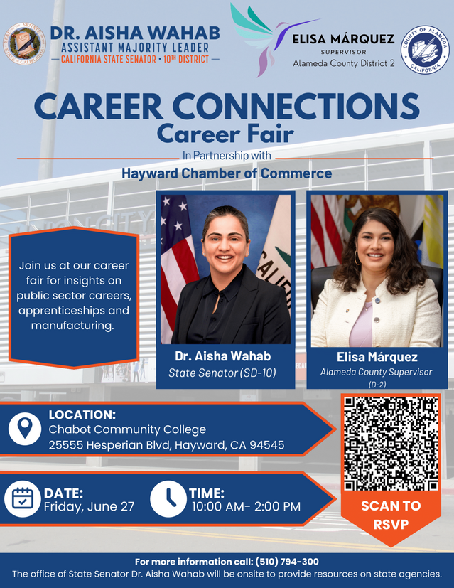 Join us at a career fair hosted by Senator Aisha Wahab and Supervisor Elisa Márquez in partnership with the Hayward Chamber of Commerce.