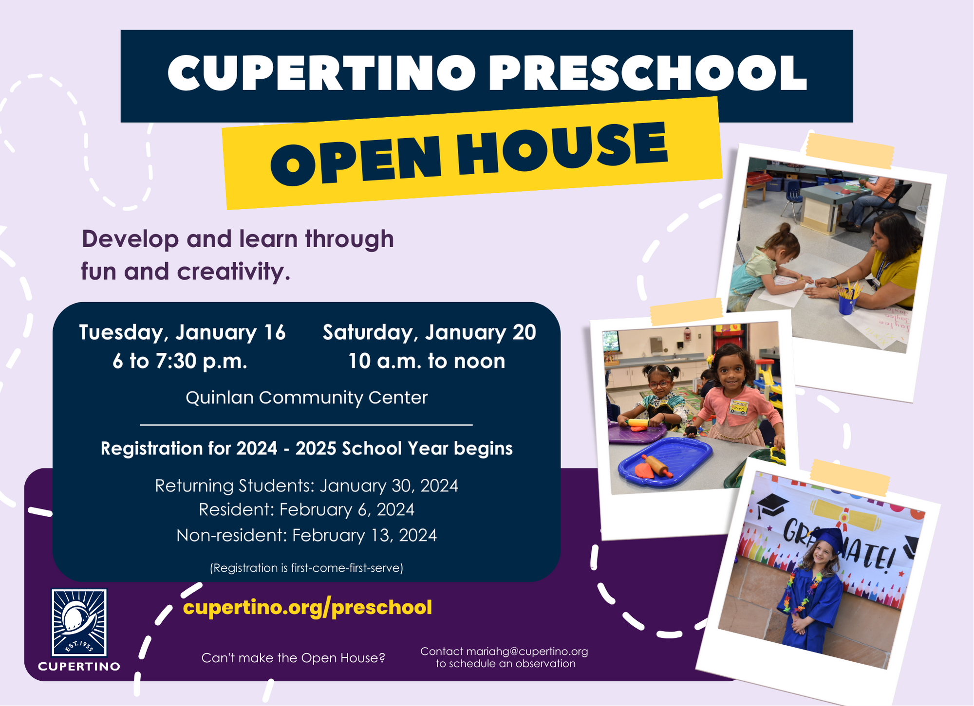Join Cupertino Preschool at an upcoming Open House (parents and kids welcome)! Tour our indoor and outdoor spaces, ask questions, connect with our teachers and administrators, and learn about our preschool program.