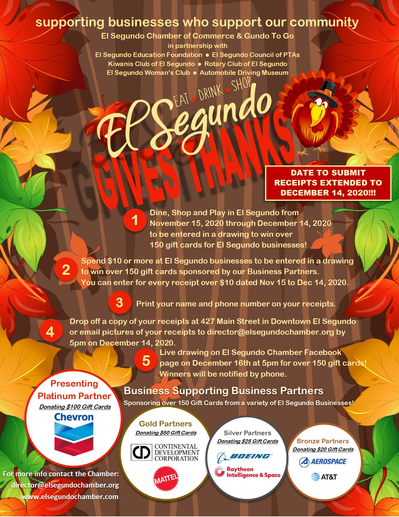 Earlier this month, the El Segundo Chamber of Commerce launched the "El Segundo Gives Thanks" campaign that offers the community the chance to win up to $7,000 in gift cards by supporting El Segundo Businesses.