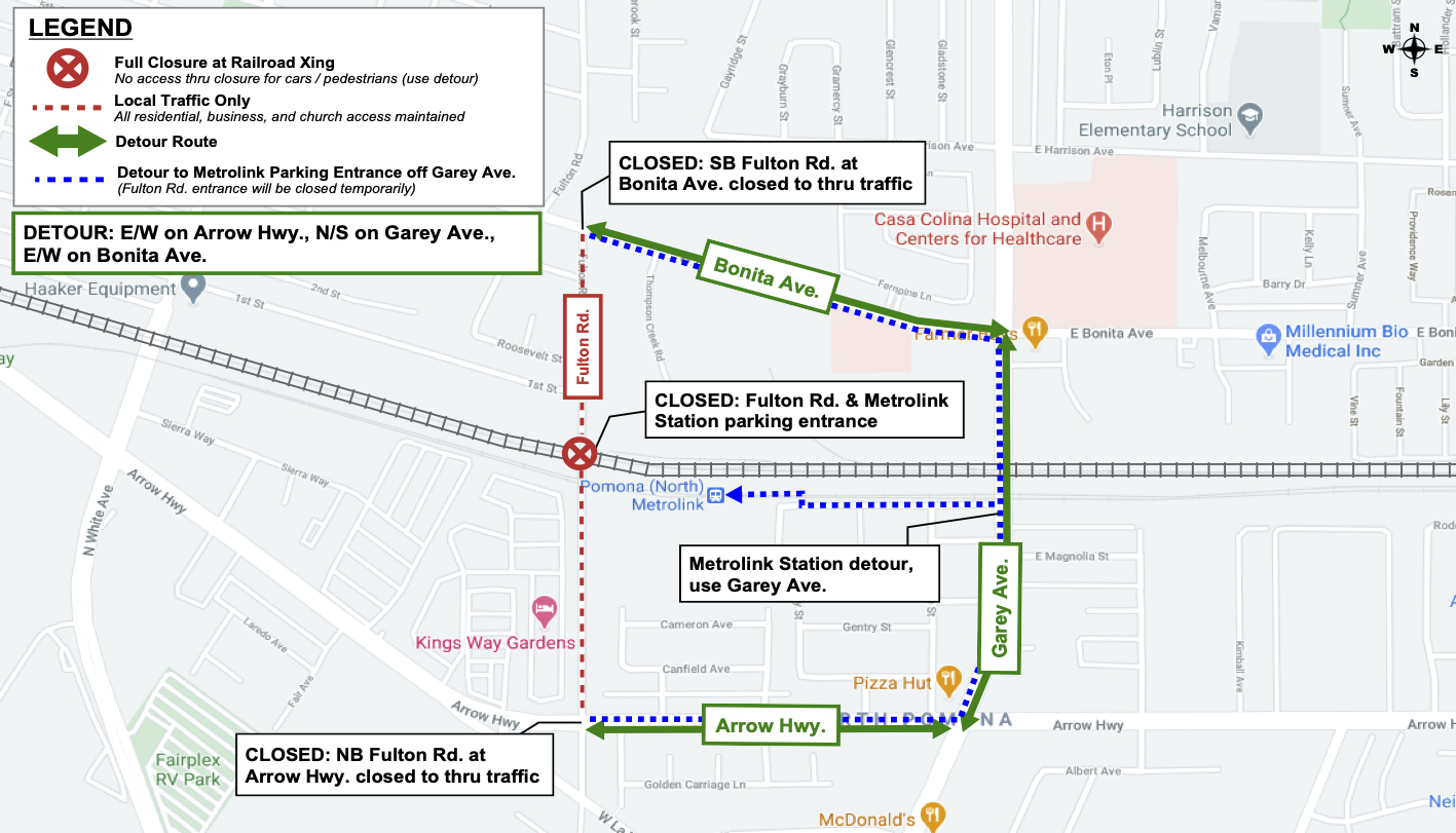 - Fulton Rd. will be fully closed to all traffic at the railroad crossing between Arrow Hwy and Bonita Ave.