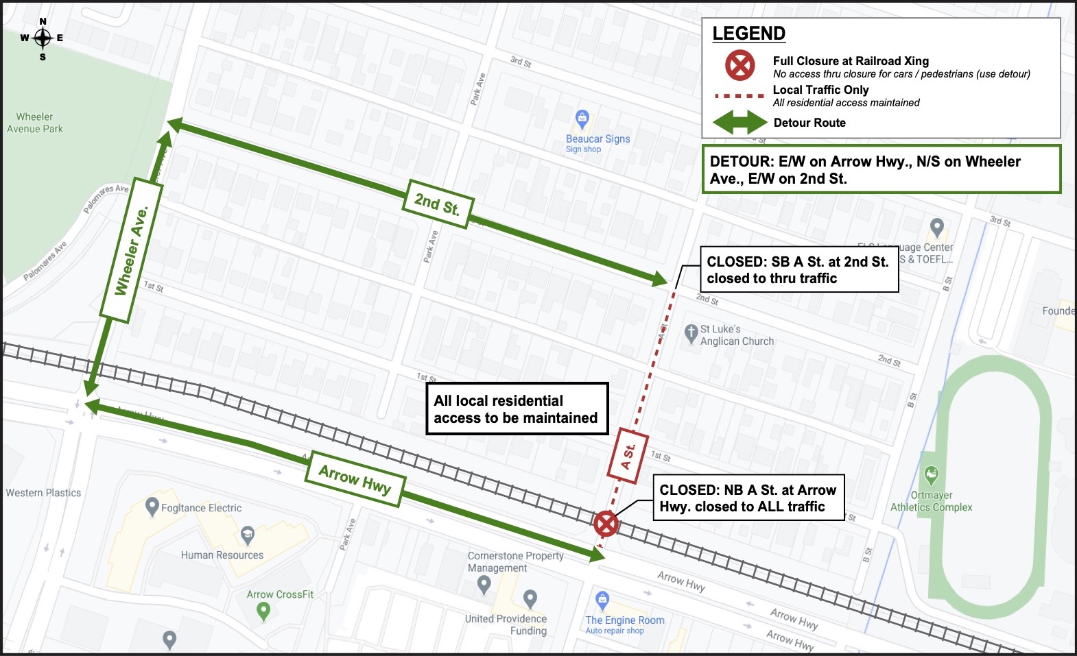 - A St. will be fully closed to vehicular and pedestrian traffic at the railroad crossing north of Arrow Hwy.