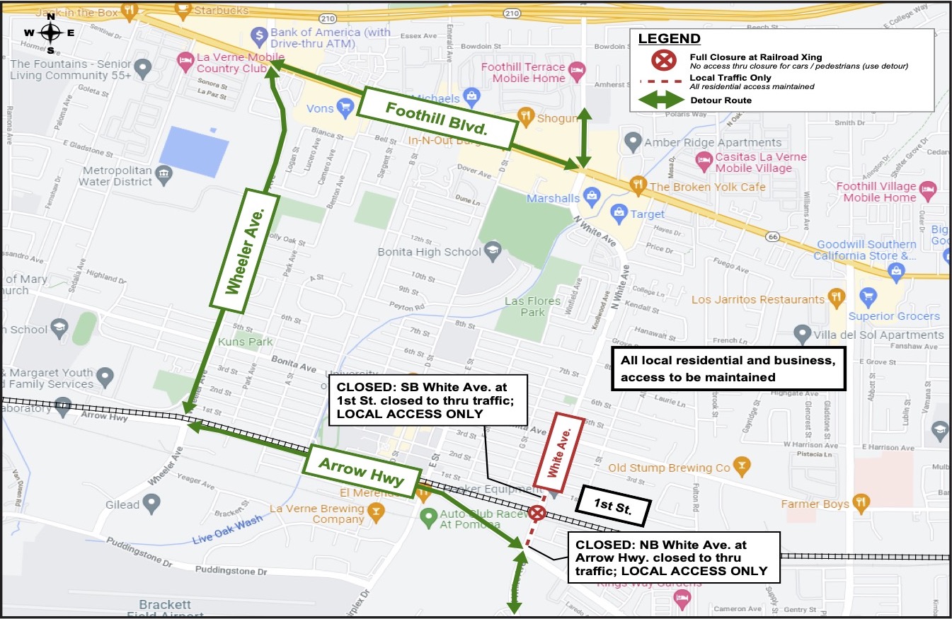Beginning Friday, December 3, 2021 and continuing daily thru April 30, 2022, White Ave. will be fully closed to all traffic (vehicular and pedestrian) at the railroad crossing north of Arrow Hwy. 24 hours a day/7 days a week. Arrow Hwy. (south of the crossing) and Foothill Blvd. (north of the crossing) will remain open and accessible by way of detour routes, see map below.