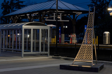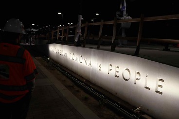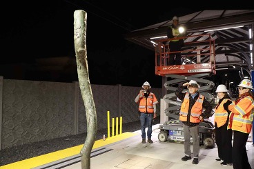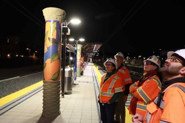 At the four new stations, Construction Authority and KPJV staff, along with the city-selected station artists, have been carrying out nighttime lighting tests for the installed station artworks, as seen in the photos above. The goal of these lighting tests is to find the optimal placement of lights to allow future riders the best experience possible when viewing the station art at night.