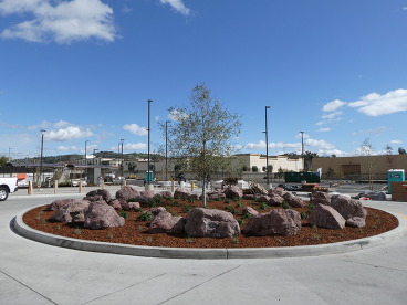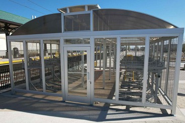 Photos of station area amenities (top to bottom): Landscaping, pedestrian walkway, benches at drop-off/pick-up areas and secure bike lockers