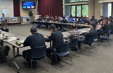 Photos: First responders conducting emergency drills at San Dimas station (top) and San Dimas Canyon Rd. grade crossing (middle); (bottom) First responders holding tabletop exercises