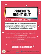 Pacific Community Center Drop off the kids for a night of fun activities, friends, food and a movie. The fee is $15.00 per child, ages 6 to 12 years old. Participants are encouraged to bring pajamas, a blanket and a pillow. For more information, please call (818) 548-4098. |