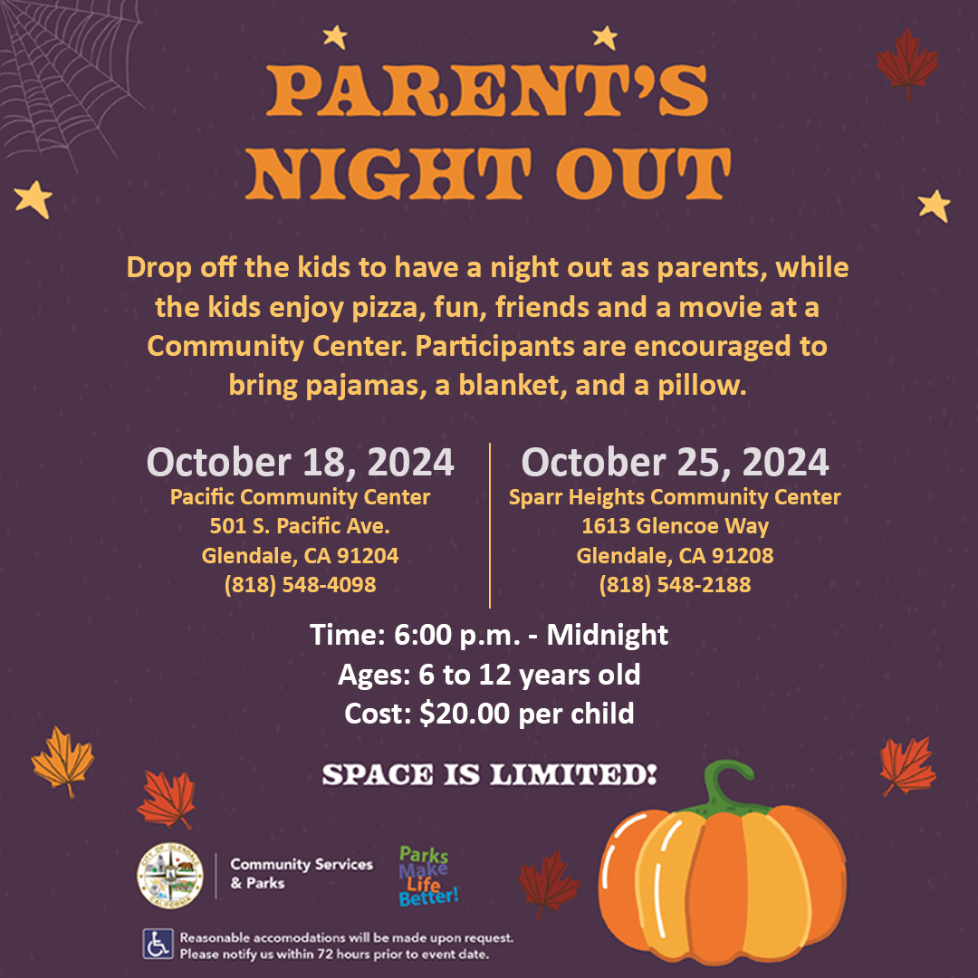 Drop off the kids for a night of fun activities, friends, food and a movie. The fee is $20.00 per child, ages 6 to 12 years old. Participants are encouraged to bring pajamas, a blanket and a pillow. Register online at MyGlendaleParks.com. For more information, please call (818) 548-4098.