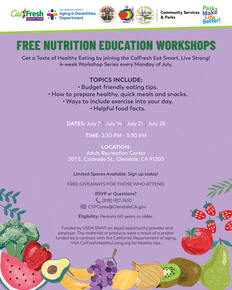 Join us every Monday in July at the Adult Recreation Center for the CalFresh Eat Smart, Live Strong 4-week workshop series!