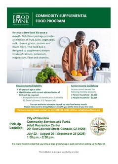 The LA Regional Food Bank will be distributing food to seniors 60 years and older at the Adult Recreation Center. This program helps provide nutritious food to eligible older adults in our community, ensuring they have access to essential groceries.