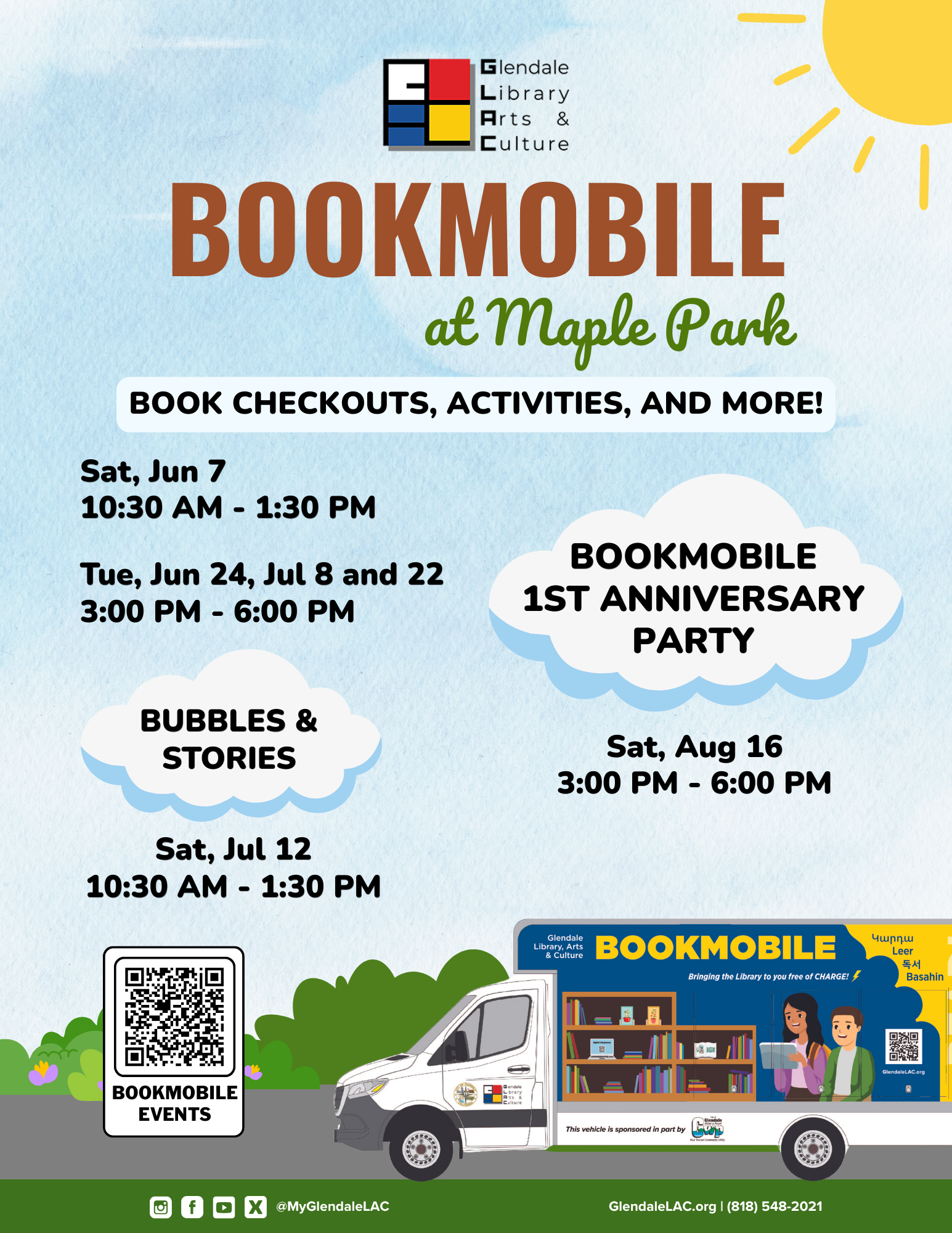 The Glendale Library, Arts & Culture Bookmobile is rolling into your neighborhood! Visit Pacific Park and Maple Park for a special opportunity to check out books, enjoy storytime, and take part in fun, family-friendly activities—right in your local park.