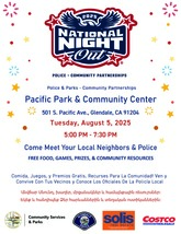 For more information about National Night Out at Pacific Community Center, please contact John Maghaguian at (818) 937-7247 or JMaghaguian@GlendaleCA.gov. To learn more about National Night Out and to find the event nearest you, visit GlendaleNNO.com.