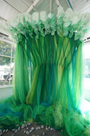 Of Wave and Stones by Yeu Q. Nguyen is on display at the Adams Square Mini Park Gas Station from Monday, July 28 - Friday, September 19, 2025. Using water as a symbol for the quiet determination that allows us to inevitably triumph over obstacles, Of Wave and Stones pays homage to the ancient Asian wisdom on the power of resilience and the courageous immigrants and refugees who made their new lives in America. Its structural design, inspired by the construction of a bridal veil, and the use of delicate tulle debunks the myth of feminine fragility and celebrates power as a balance embodying both strength and softness.
