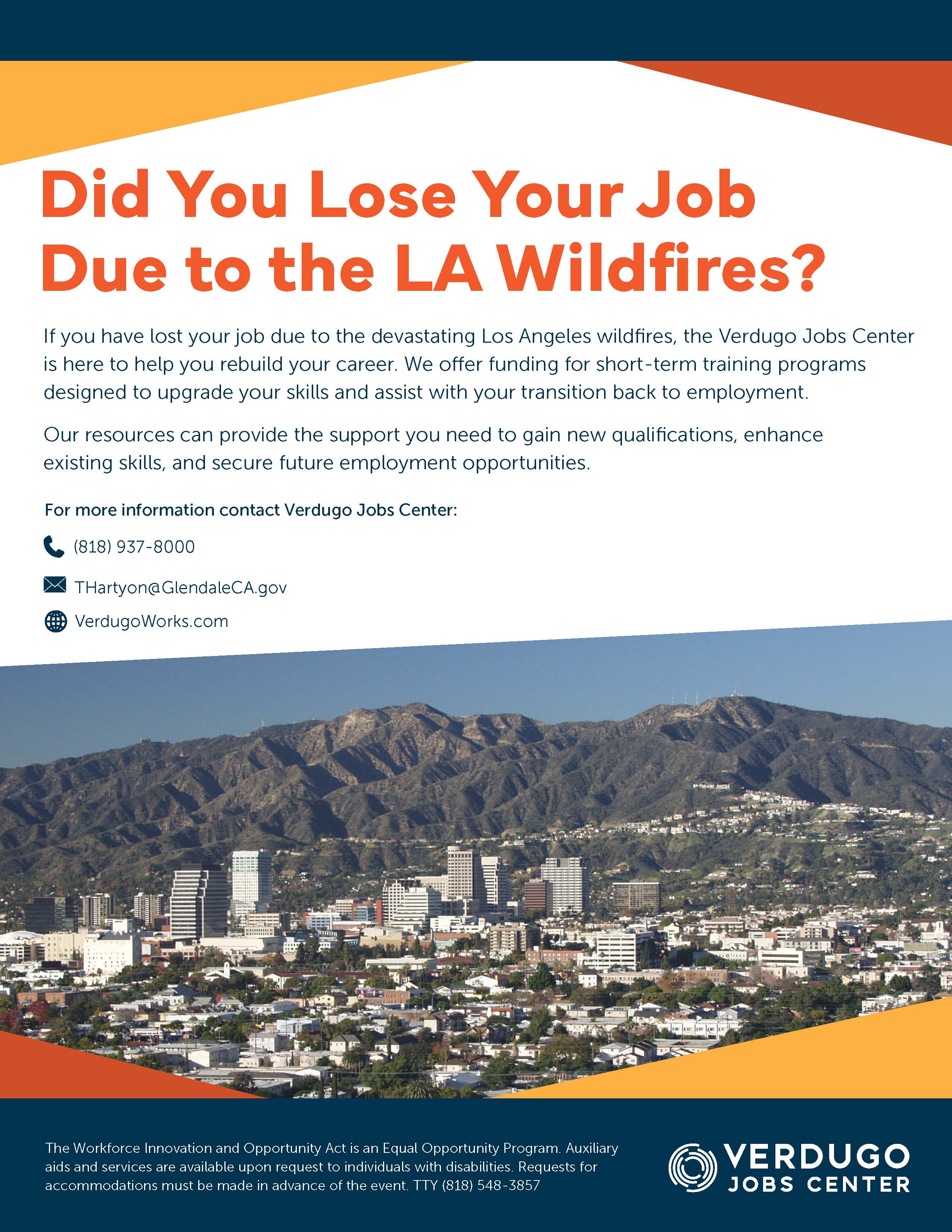 The VJC has received limited funds to provide workforce assistance, such as job search or skills upgrading to individuals who have lost their job due to the Los Angeles Wildfires. Contact VJC to see if you qualify at VerdugoWorks.com or call (818) 937-8000.
