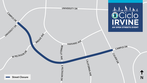 Campus Drive will be closed to vehicles between University Drive and Culver Drive Saturday, May 3, between 5 a.m. and 8 p.m. for the second annual CicloIrvine: An Open Streets Event.