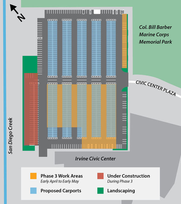 Phase 3 will have a significant impact on the availability of parking near the Civic Center entrance. Work will be done Monday through Saturday from 7 a.m. to 7 p.m. Additional parking is available off of Harvard Avenue and San Juan.