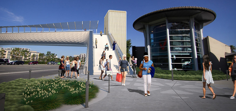 The 175-foot bridge will span Jamboree Road and feature a modern stainless-steel design with Corian cladding, translucent panels, and programmable LED lighting.