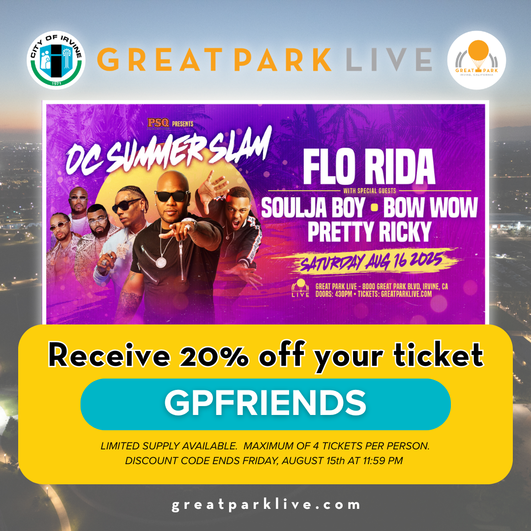 Get ready for OC Summer Slam at Great Park Live, featuring Flo Rida, Bow Wow, Soulja Boy, and Pretty Ricky Friday, August 16. Use code GPFRIENDS for 20% off — limit four tickets per person. Offer ends August 15.