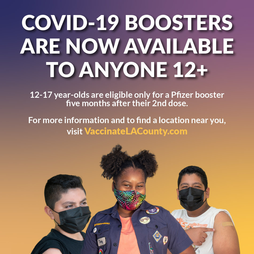 Booster doses are now available to anyone 12 and older. For more information on booster doses and to make an appointment, visit VaccinateLACounty.com