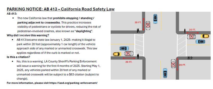 A new California state law, Assembly Bill 413, took effect on January 1, 2025. This law prohibits parking within 20 feet of both marked and unmarked crosswalks, and within 15 feet of any curb extension. The Los Angeles County Sheriff’s Department Parking Enforcement Detail is currently issuing warnings for violations until April 30, 2025. Starting on May 1, 2025, fines of $63 (subject to change) will be issued for these violations. For more information, please visit lasd.org/parking-enforcement.