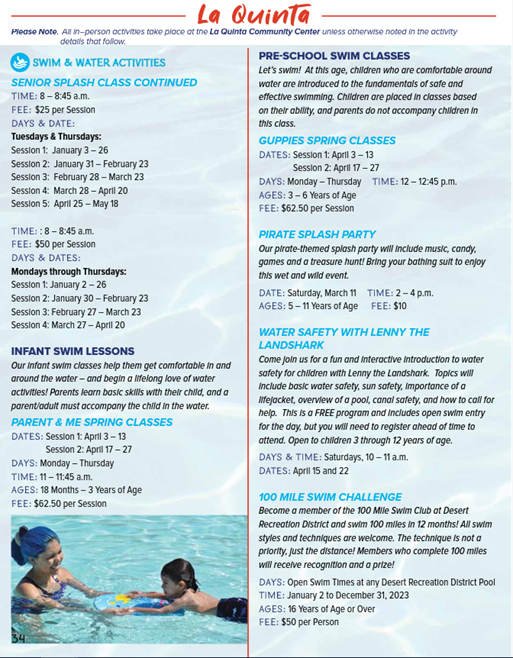 La Quinta's Fritz Burns Pool has plenty to offer visitors of all ages. Activities include Arthritis Water Therapy, Aqua Fit, Adult Water Aerobic, and Open/Lap Swim just to name a few. The pool is located on the corner of Avenida Bermudas and Avenue 52 in La Quinta, CA. Please contact (760) 771-4347 for more information or visit https://www.laquintaca.gov/FBpool.