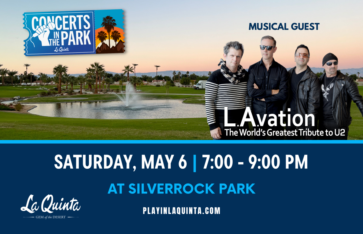 Bring your chairs or blankets and join the City of La Quinta for Concerts in the Park at SilverRock Park on Saturday, May 6, from 7 - 9 p.m.! The musical guest this month is L.A.vation, an authentic U2 tribute band.