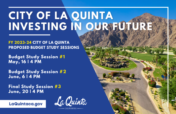 The City invites you to participate in public meetings regarding the fiscal year 2023/24 budget. The first Budget Study Session will be held during the City Council Meeting on Tuesday, May 16, at 4 p.m., in the City Hall Council Chambers. Please check the posted agenda for that meeting when available or visit https://www.laquintaca.gov/ProposedBudget for more information.