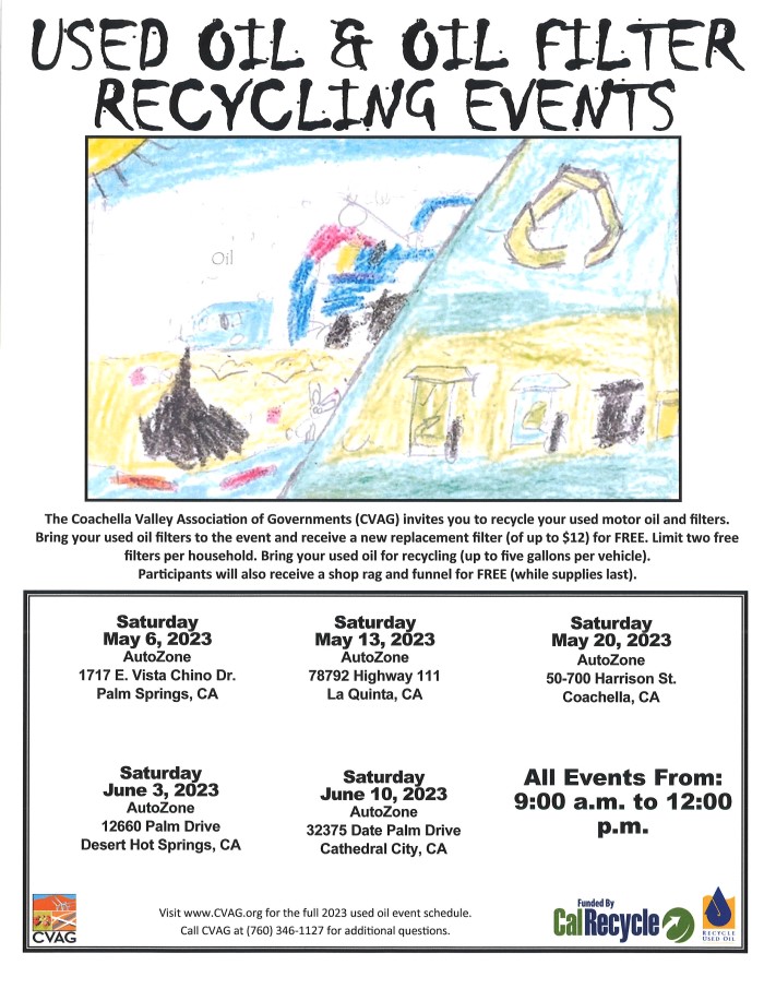 Drop-off your used oil and oil filters at the La Quinta AutoZone at 78792 Highway 111 on Saturday, May 13, 2023, from 9 a.m. to 12 p.m.