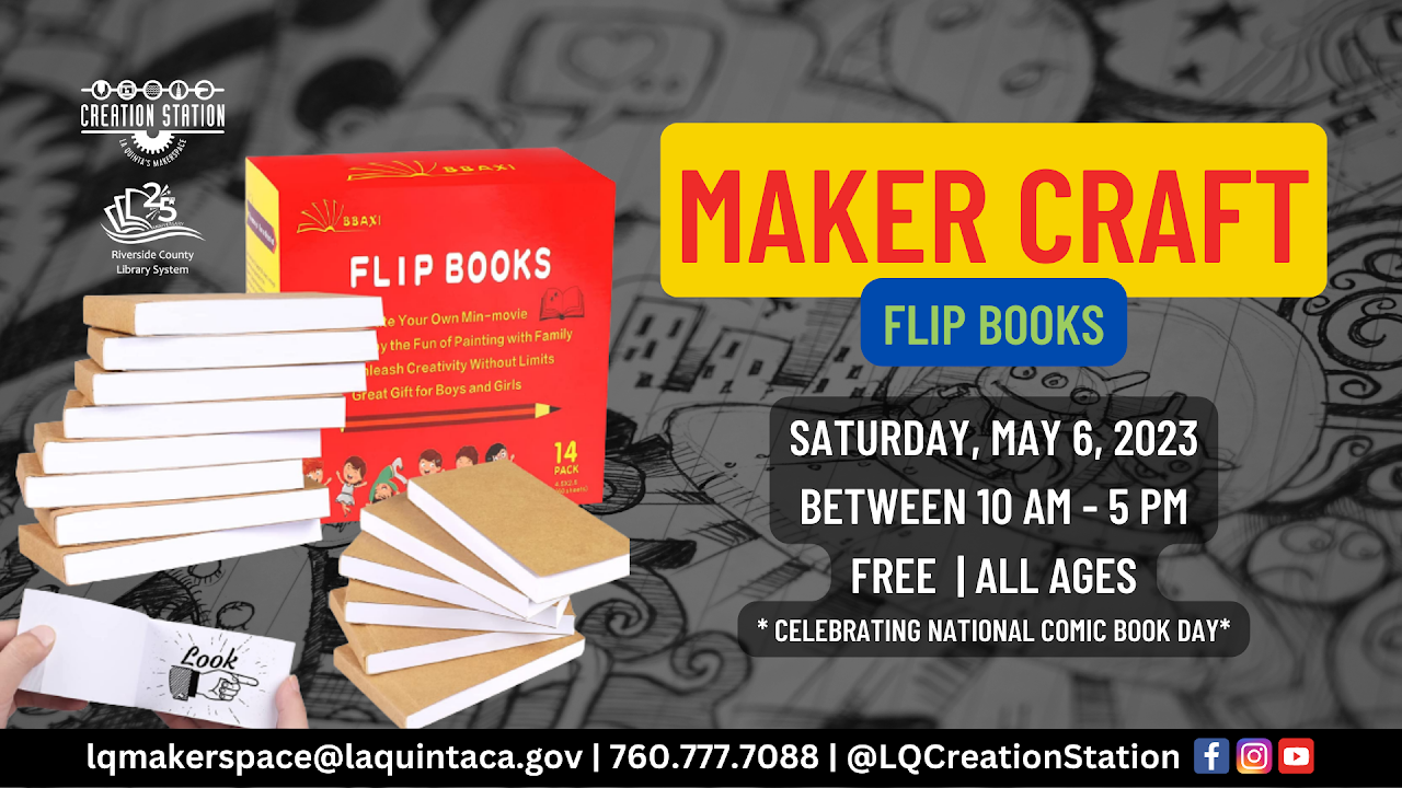 Stop by the Creation Station on Saturday, May 6, from 10 a.m. to 5 p.m. Learn how to make a flip book, one of the earliest forms of animation, as we celebrate National Comic Book Day. Other comic book crafts will be available too. FREE while supplies last. All ages welcome. For more information, call (760) 777-7088 or email lqmakerspace@laquintaca.gov.