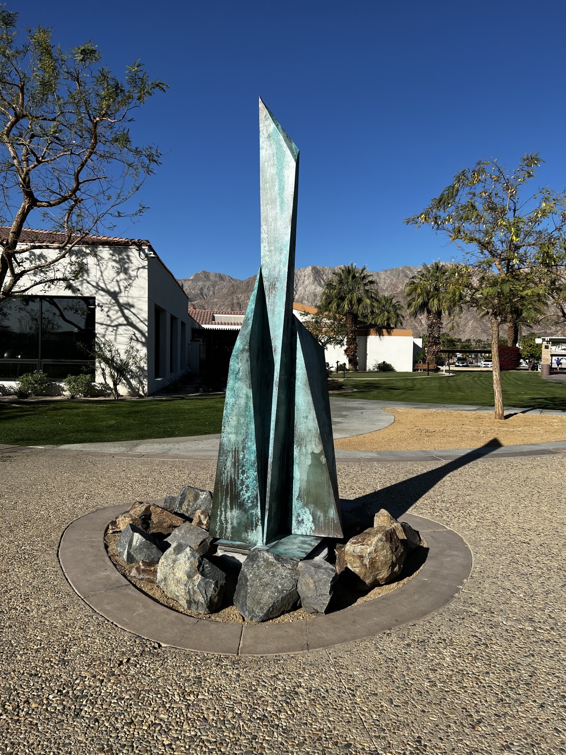La Quinta’s Harmony is one of Charles Sherman’s Miracle Towers, sculptures inspired by the pyramids of Ancient Egypt and based on interpretations of the tetrahedron geometric form. The 10-foot tall sculpture in Civic Center Park was fabricated from hand-welded stainless steel and features a chemically activated patina that creates the turquoise-blue color. The convergence of the triangles at the apex of the art piece is counter-pointed by the stability of the perfectly balanced triangles that meet at the sculpture's base.