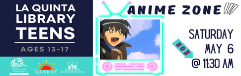 Anime Zone (ages 13-17) on Saturday, May 6 at 11:30 a.m. NEW TIME! Now offered in the morning. Enjoy random anime with friends. Commentary encouraged!