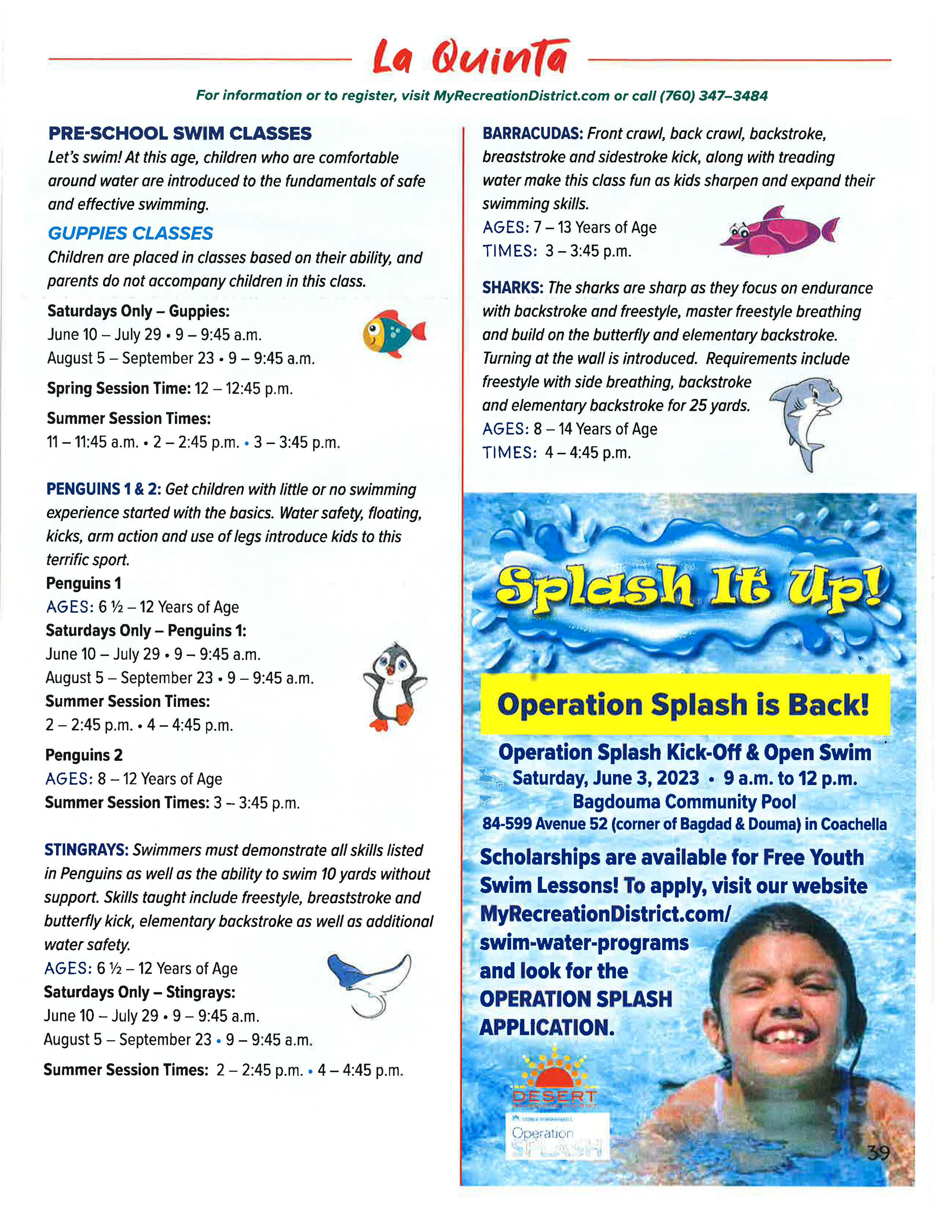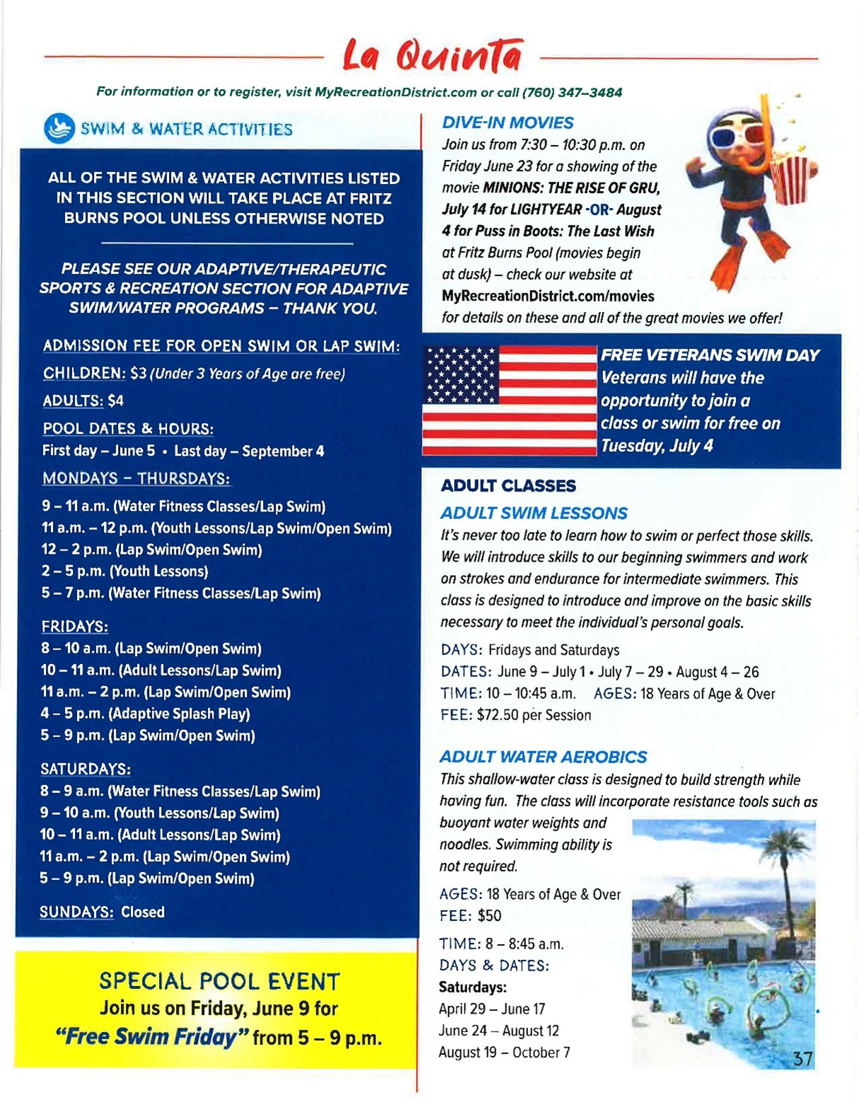 La Quinta's Fritz Burns Pool has plenty to offer visitors of all ages. Activities include Arthritis Water Therapy, Aqua Fit, Adult Water Aerobic, and Open/Lap Swim just to name a few. The pool is located on the corner of Avenida Bermudas and Avenue 52 in La Quinta, CA. Please contact (760) 771-4347 for more information or visit www.laquintaca.gov/FBpool.