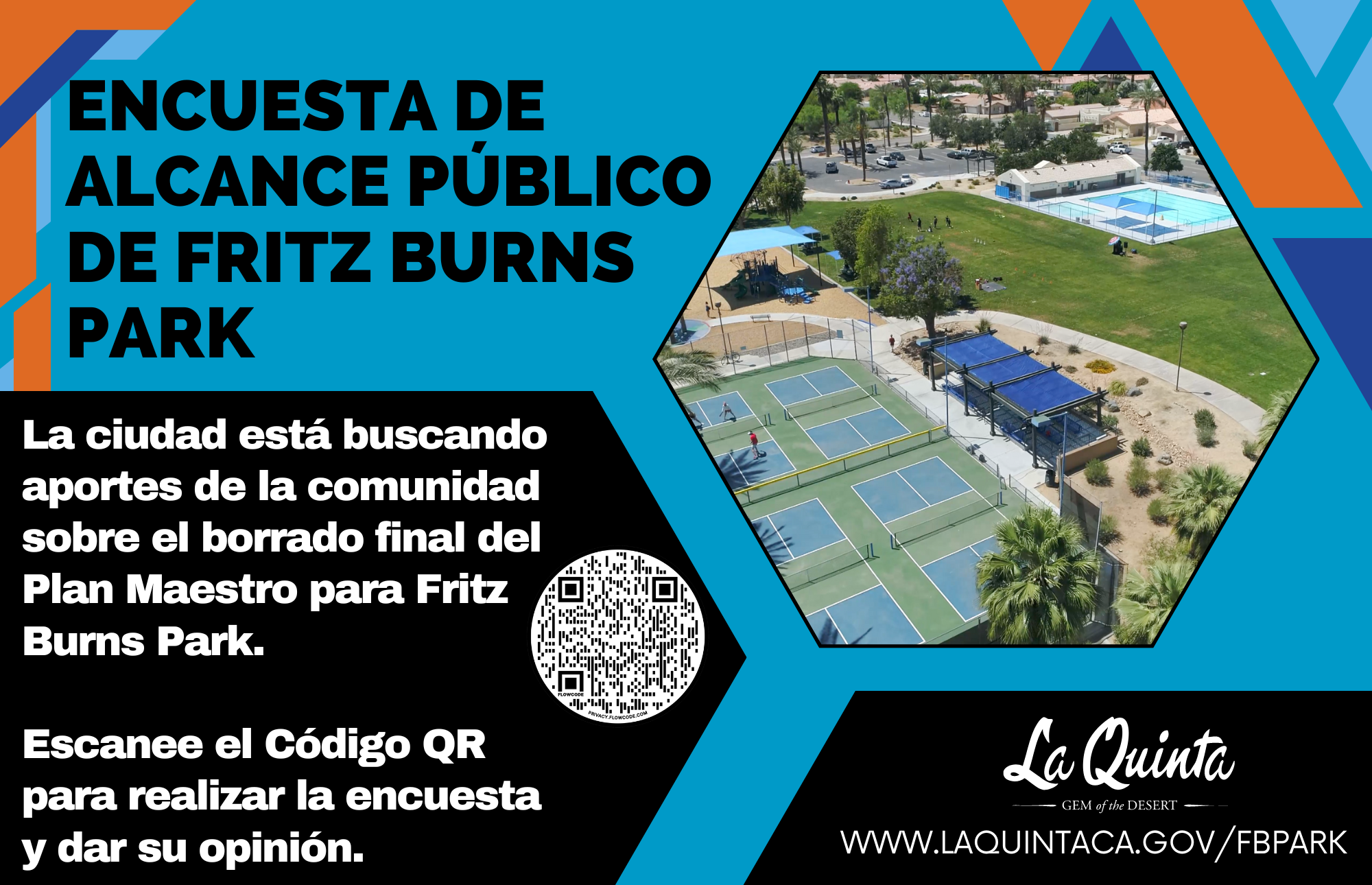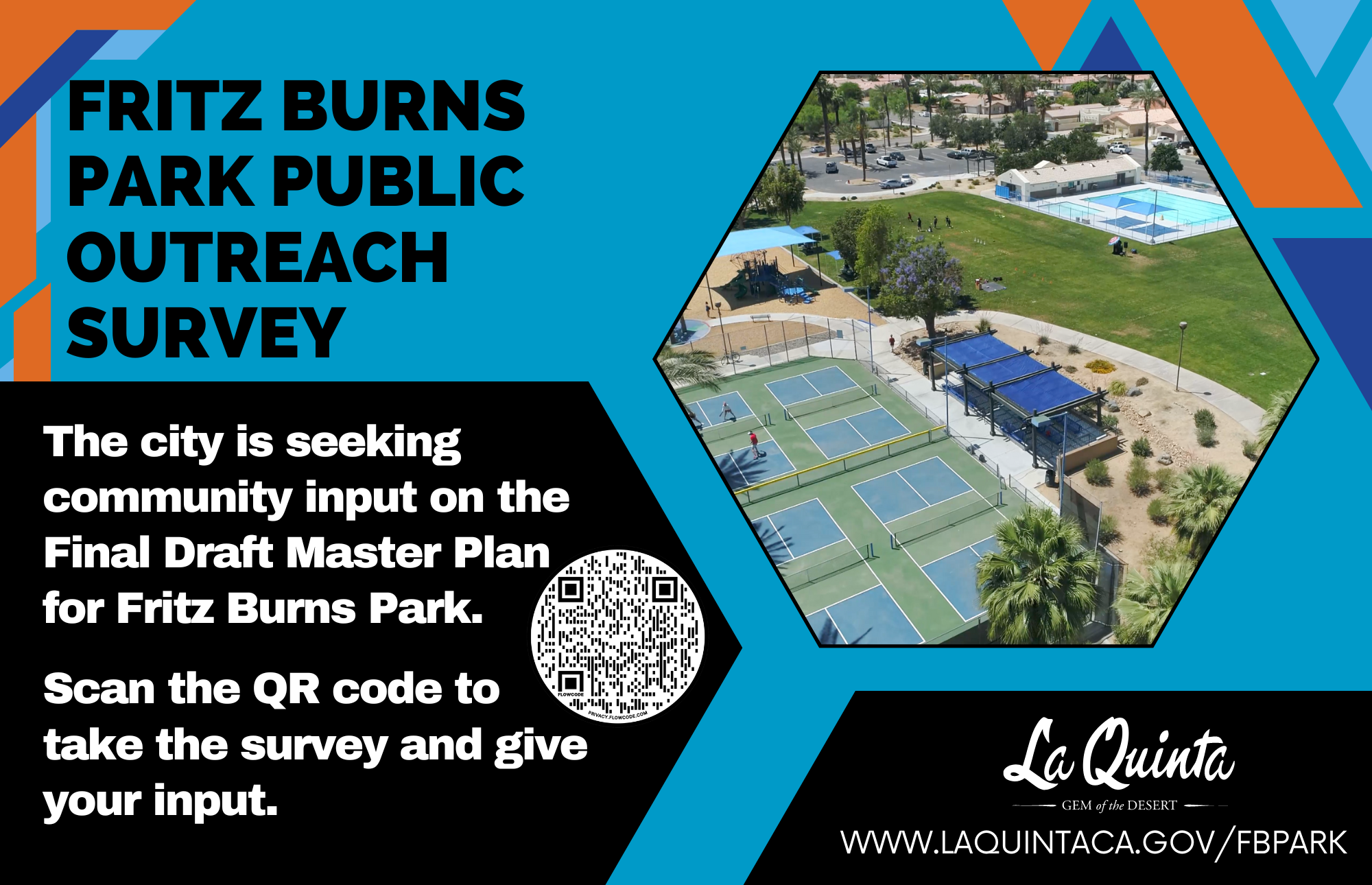 The City of La Quinta is seeking input on the proposed draft master plan for Fritz Burns Park. You can share your input by taking the community survey by scanning the QR code in the image above or visiting the City website at www.laquintaca.gov/fbpark.
