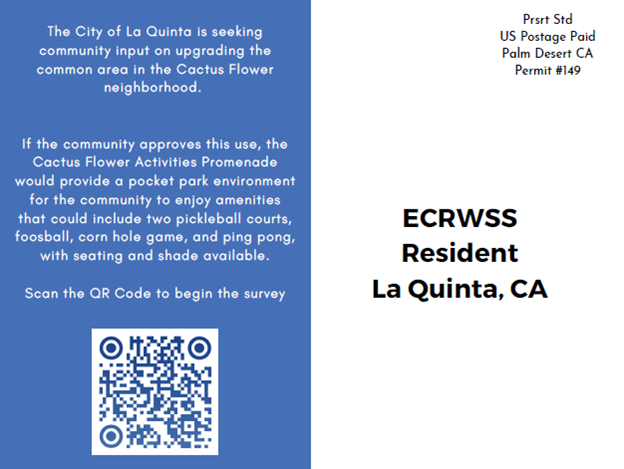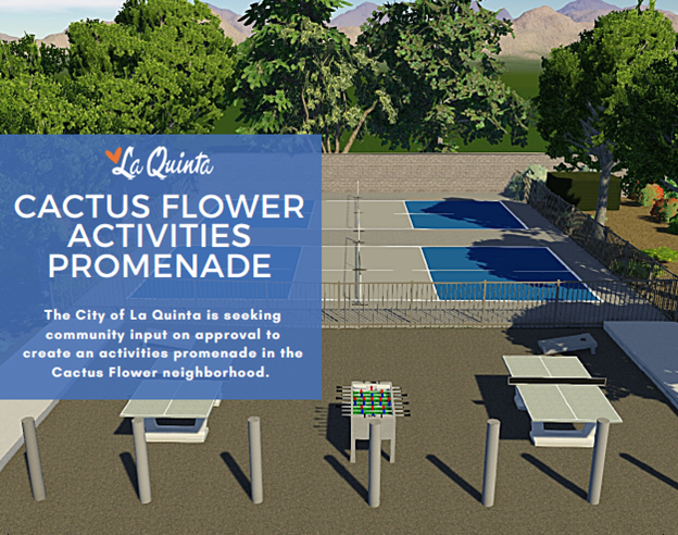 Cactus Flower – The City of La Quinta is seeking community input on approval to create an activities promenade in the Cactus Flower neighborhood. Please scan the QR code below to begin the survey.
