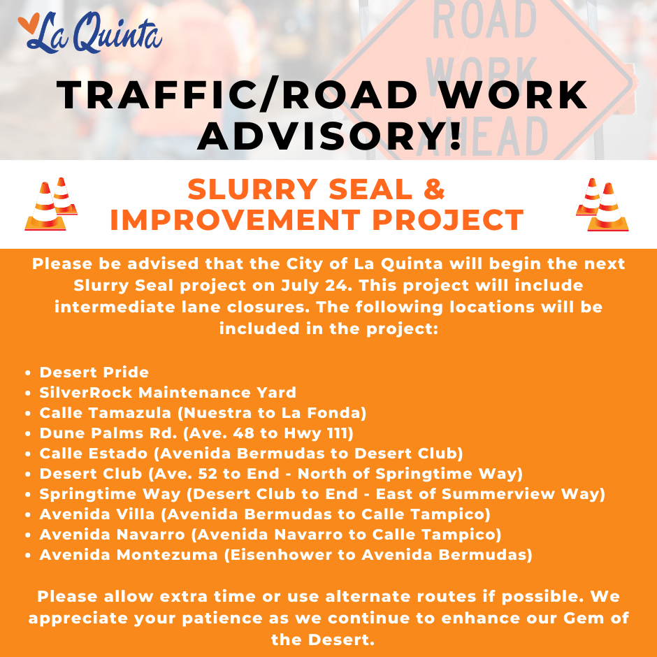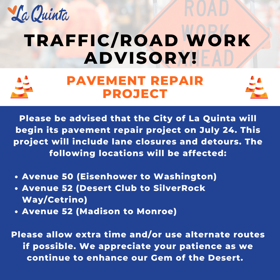 The City of La Quinta is beginning two road work projects starting July 24: Slurry Seal and Pavement Repair. The Slurry Seal project will include intermediate lane closures and the project areas are listed in the image above. The Pavement Repair project will include lane closures and detours and the project areas are listed in the image below. Please allow extra time and/or use alternate routes if possible. We appreciate your patience as we continue to enhance our Gem of the Desert.