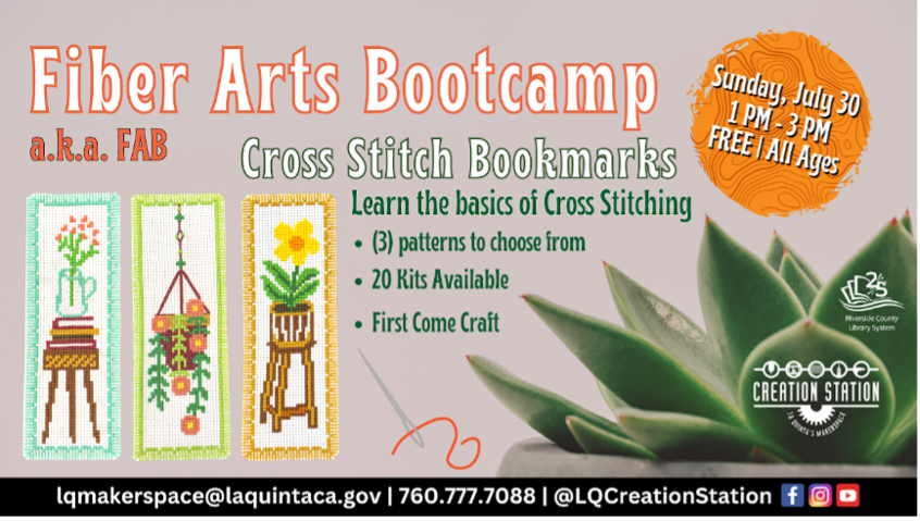 Fiber Arts Bootcamp: Join the Creation Station for our next FAB craft. Cross Stitch Bookmarks Sunday, July 30, from 1:00 P.M. – 3:00 P.M This month we will learn the basics of cross stitch, which is one of the simplest forms of embroidery, which dates back to around 200 AD-500 AD. After learning the basics, patrons can select one of (3) patterns to create a plant inspired bookmark. All the supplies needed for the craft will be supplied to take the craft home to finish. (Except Scissors) This craft is limited to the first 20 patrons as there are only 20 kits available. No RSVPs, first come only.