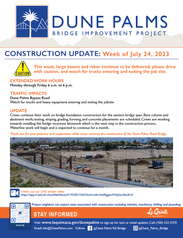 The Dune Palms Road Bridge Improvement Project will construct an all-weather access bridge across the Coachella Valley Storm Water Channel in La Quinta (see map for project area). The new, 480-foot-long bridge will address flooding and excess debris on the existing roadway during storms. The project began on January 30, 2023. For more information or to receive updates, please visit www.laquintaca.gov/DunePalms.