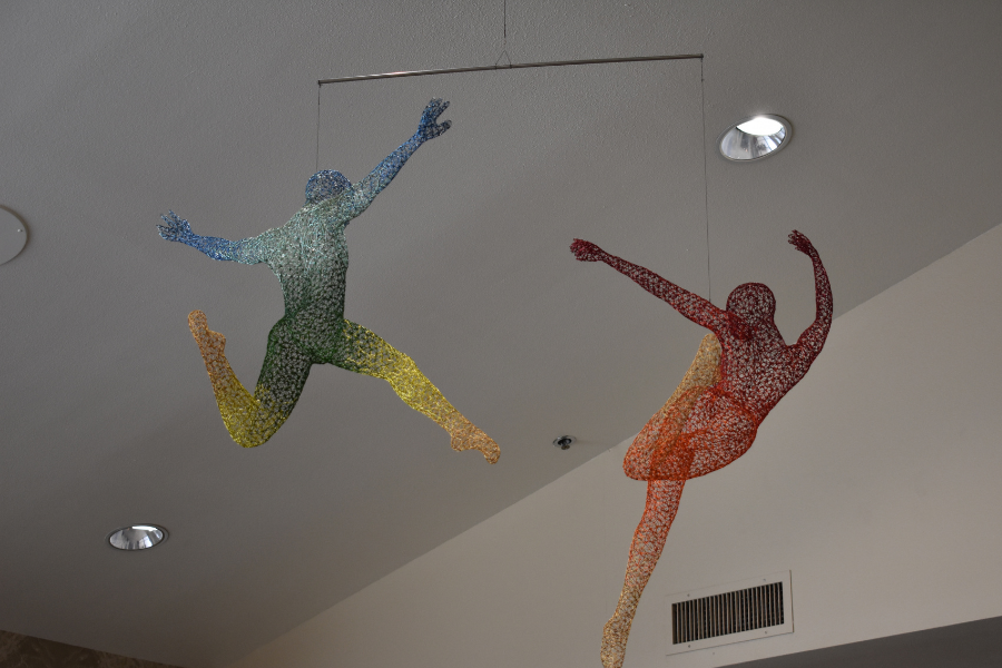 Grace and Milo are beautiful wire sculptures displayed in the lobby of the Wellness Center. Artist Michael Gard creates his sculptures using a wire weaving technique he invented as a teenager. Each figure begins as a block of clay and a spool of wire. The clay is sculpted and then reproduced in wax. Individual lengths of wire are woven and knotted stitch-by-stitch around the wax form. Finally, the wax is melted away, leaving a rigid figure, both light and strong. Grace and Milo were purchased during the 2019 La Quinta Art Celebration.