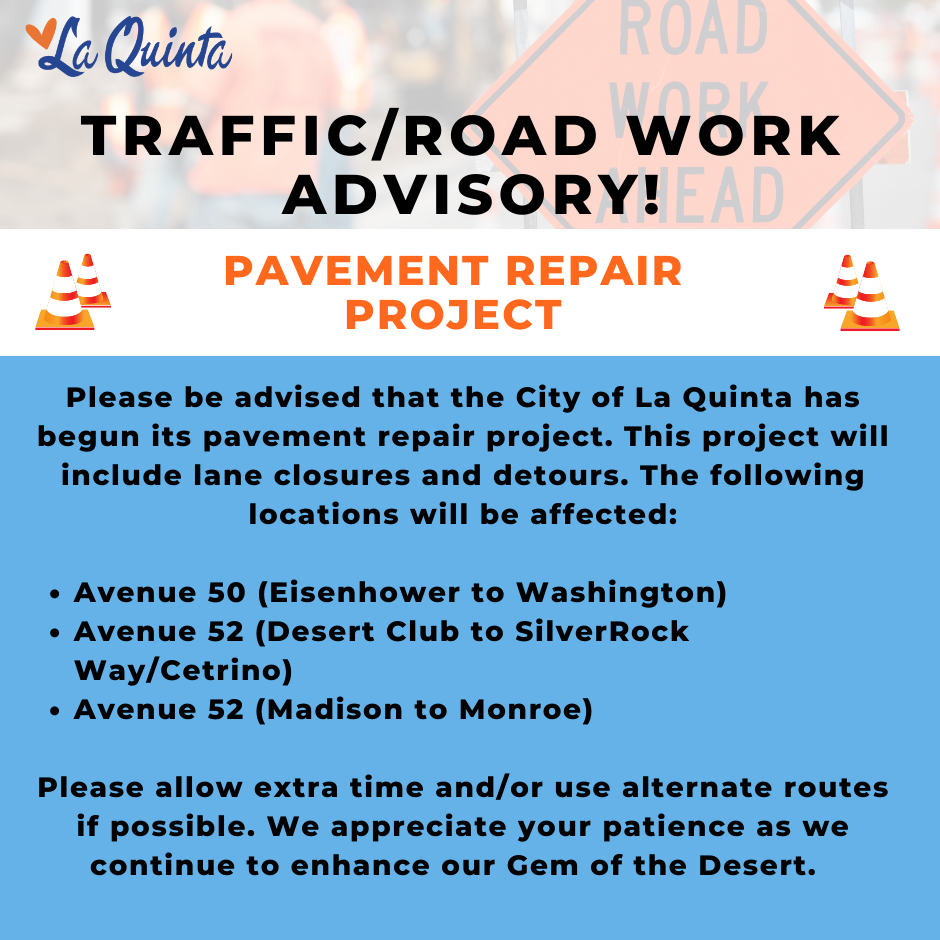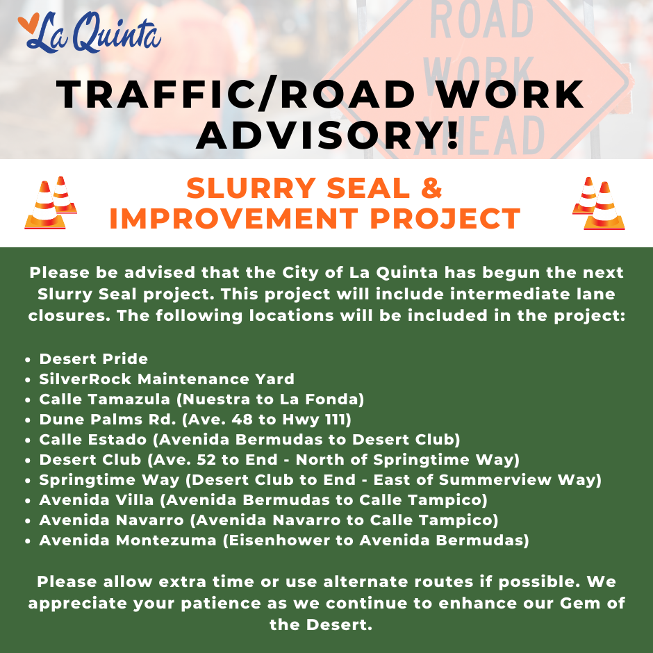 The City of La Quinta has begun two road work projects. The Slurry Seal project will include intermediate lane closures and the project areas are listed in the image above. The Pavement Repair project will include lane closures and detours and the project areas are listed in the image below. Please allow extra time and/or use alternate routes if possible. We appreciate your patience as we continue to enhance our Gem of the Desert.