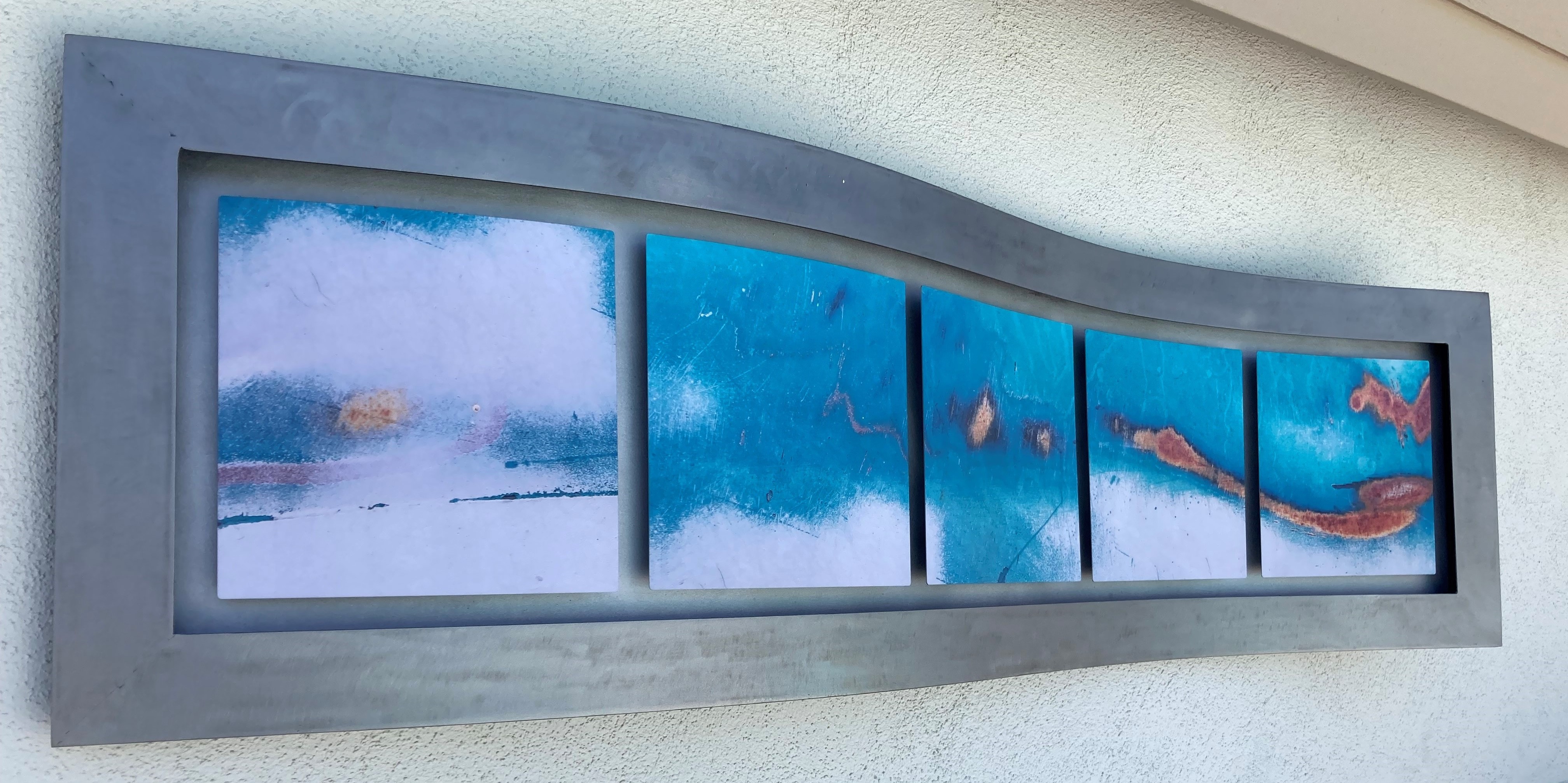 Josh Hirt is an independent visual artist that works in mixed media, namely enamel paint, macrophotography, wood, and metal. His work is contemporary and typically utilizes abstract imagery, while his steel frames lend an industrial feel. The abstract images, made from Hirt’s appreciation of decaying architecture, are heavily influenced by his upbringing as a builder and as a traveler. Hirt could see the artistic beauty of things forgotten but was unsure how to translate this into a body of work. This deep appreciation led to passion, which led to exploration, and eventually with the combination of his years of experience as an artist and builder, into mixed media. Over the years, Hirt has learned to capture his subjects closely, utilizing a full-frame camera and macro lens. Using dye sublimation, he is then able to process the image, which is then heat transferred onto metal and is ready for framing and mounting. Hirt then begins a process of several nontraditional techniques to mount and frame his pieces. No two are exactly alike for the simple reason that most of Hirt’s materials are repurposed and each frame is handmade from scratch. With the use of grinding, welding, overlaying, hammering, rusting, pouring, dripping or including natural pigments and physical differences in his materials, Hirt obtains more depth and complexity in his work. To compliment textures from within the image, he can polish or distress the metal for a clean, modern look, or hand-rust for a warmer richness and truly unique esthetic. His goal with each piece is to manipulate material, color, and composition, as it is his perpetual challenge to bring beauty out of decay. Maori is made from pieces salvaged from a vintage Cadillac and is on display at the Fritz Burns Pool.
