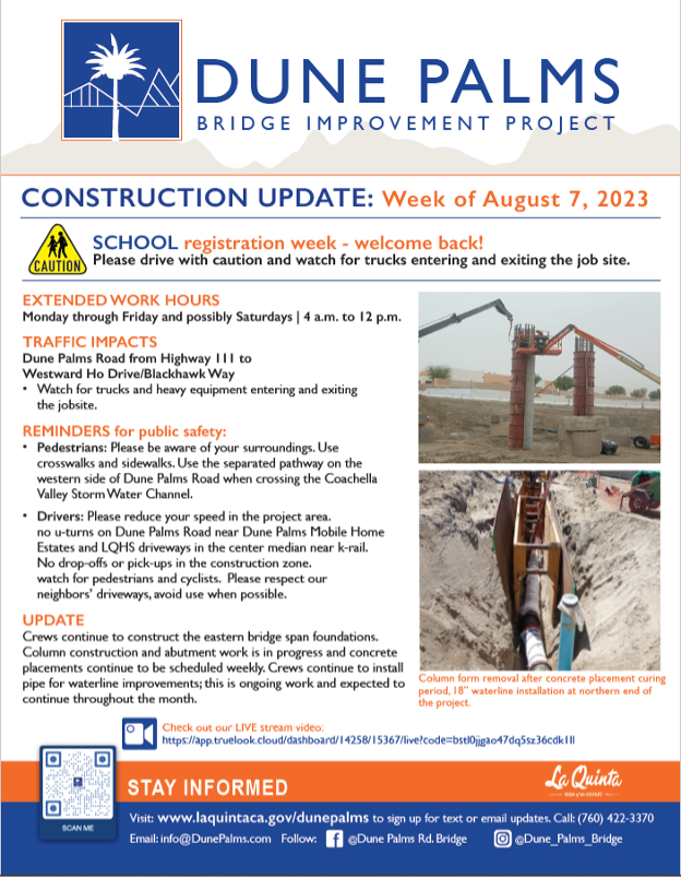The Dune Palms Road Bridge Improvement Project will construct an all-weather access bridge across the Coachella Valley Storm Water Channel in La Quinta (see map for project area). The new, 480-foot-long bridge will address flooding and excess debris on the existing roadway during storms. The project began on January 30, 2023. For more information or to receive updates, please visit www.laquintaca.gov/DunePalms.
