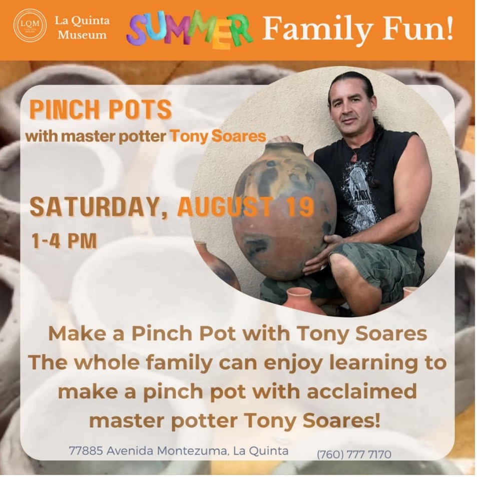 SUMMER FAMILY FUN! Saturday, August 19, 1:00 P.M. - 4:00 P.M. Make a Pinch Pot with Tony Soares. The whole family can enjoy learning to make a pinch pot with acclaimed potter Tony Soares! Tony learned the fundamentals of pottery from his grandmother at age 7, starting a more than 30-year journey to revive the fading art of olla making through his experimentation with local clays and indigenous hand-building techniques. Tony shares his knowledge to ensure that Native American pottery making is never lost. Tony’s pottery is in art galleries, museums, and personal collections around the country, and he has taught at many venues including the Agua Caliente Band of the Desert Cahuilla of Palm Springs and the Yuman tribes of the Colorado River, AZ.