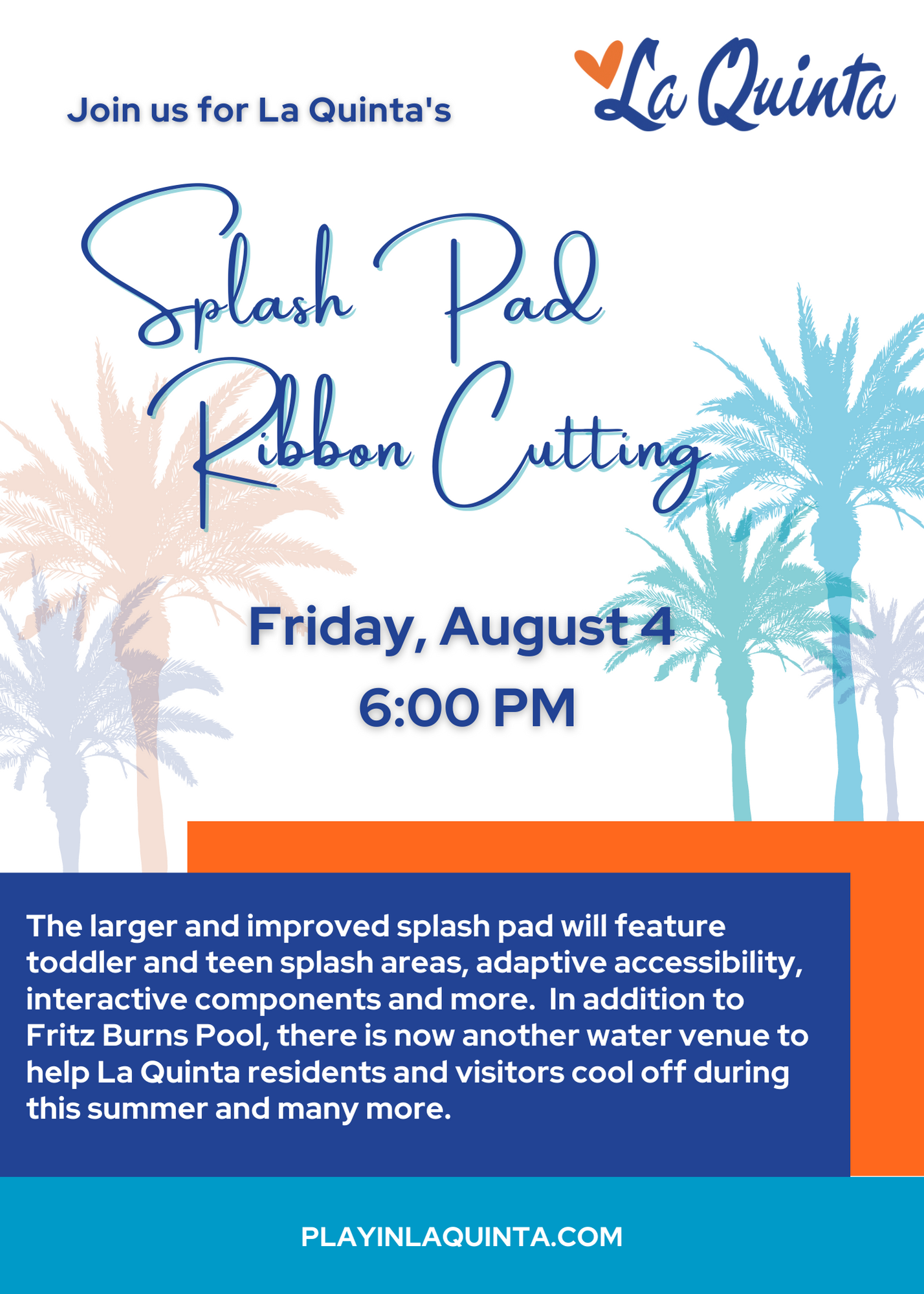 The City of La Quinta is hosting a ribbon-cutting event at La Quinta Park on Friday, August 4, at 6 p.m. to formally open the new splash pad. The larger and improved splash pad will feature toddler and teen splash areas, adaptive accessibility, interactive components, water cannons, and more. Join Council Members, Staff, and the Greater Coachella Valley Chamber of Commerce to see this exciting new recreational cool spot that is sure to be a family destination!