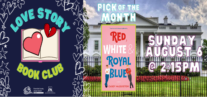 Love Story Book Club ages 18+ Sunday, August 6 at 2:15 P.M. Join us for a Happily Ever After’s not guaranteed in this traditional book club featuring romantic titles. August’s pick: Red, White and Royal Blue by Casey McQuiston. See the Adult Reference Desk to register and to ask about available copies. *Registration required*